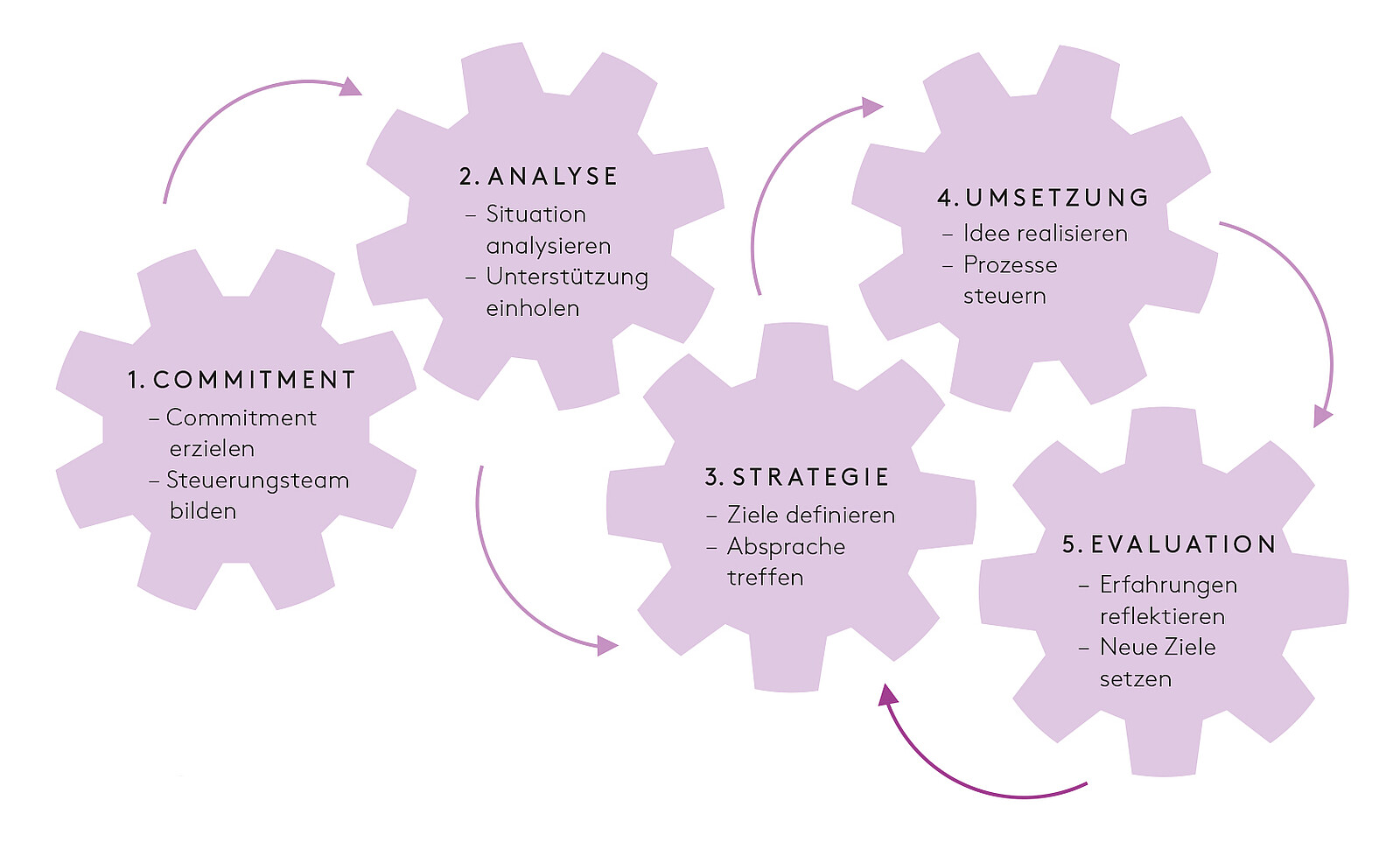 Das Ziel ist es, einen Prozess so zu etablieren und zu festigen, dass er integraler und fortlaufender Bestandteil der eigenen organisatorischen Abläufe wird. In der ersten Initialisierungsphase steht die Etablierung der eigenen Motivation für den Prozess sowohl vonseiten der Belegschaft als auch der Leitung. An dieser Stelle muss betont werden, dass die Bereitschaft der Entscheidungsträger*innen für einen WIA-Prozess ein essenzieller Faktor für das Gelingen des Prozesses darstellt. Aus der Projekterfahrung empfiehlt sich daraufhin die Etablierung eines Kernteams, das sich für die Steuerung des Prozesses und die Einbindung der Belegschaft verantwortlich zeichnet. Auf die anschliessende «klassische» Analysephase, in der eine Bestandsaufnahme der Ist-Situation erfolgt, geht es in einer dritten Strategiephase um die konkreten ersten Umsetzungen und Massnahmen. Für die Identifizierung von Zielen kommt an dieser Stelle das eingangs beschriebene Modell der Handlungsfelder zum Einsatz. Hierfür hat sich die Durchführung eines Kick-off-Workshops und die Einbeziehung der Mitarbeitenden als ratsam gezeigt. So haben bspw. Umfragen in der Belegschaft wertvolle Umsetzungsideen oder auch Beteiligungswünsche für den Prozess hervorgebracht. In einer Umsetzungsphase erfolgt dann die konkrete Realisierung von ersten Massnahmen und die Rückkopplung an die Belegschaft. Entscheidend für einen gelingenden Prozess im Sinne einer lernenden Organisation ist der Fokus auf die Evaluationsphase, die den ersten Zyklus abschliesst und einen neuen Zyklus einleitet. Hier werden die gesteckten Ziele auf ihre Umsetzungen hin überprüft und neue Ziele gesetzt bzw. nachjustiert. Ebenso viel Zeit und Ressourcen müssen an diesem Zeitpunkt aber auch auf das Reflektieren der Prozessstrukturen gelegt werden. Wie hat die Zusammenarbeit funktioniert? Welche Mitarbeitenden bzw. Perspektiven fehlen möglicherweise im Kernteam? Wie sind wir mit Herausforderungen oder nicht umsetzbaren Zielen umgegangen? Wie wollen wir in Zukunft weiterarbeiten? Raum und Zeit für solche Reflexionen zu schaffen, ist im Kern das, was eine lernende und zukunftsfähige Organisation ausmacht.