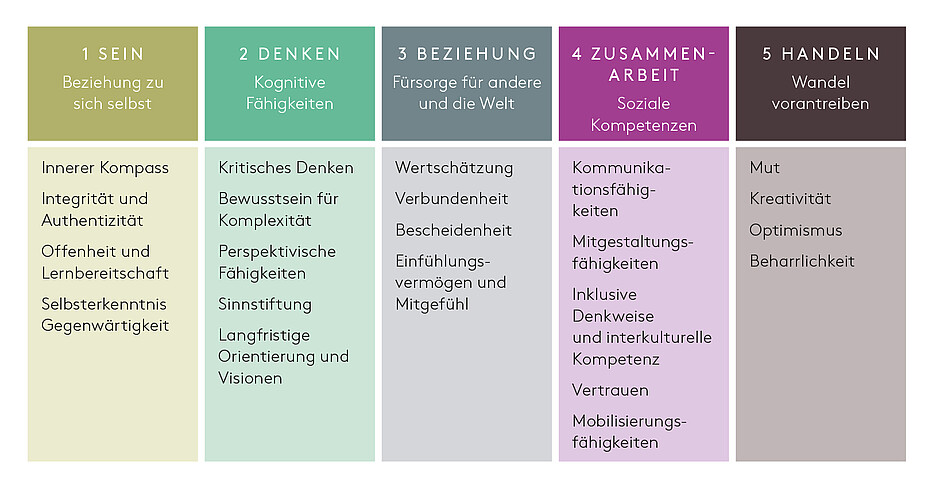 Der IDG-Rahmen ist ein offenes System, das darauf abzielt, die innere Entwicklung als Grundlage für nachhaltige Veränderungen zu fördern. Basierend auf Erkenntnissen aus Psychologie, Neurowissenschaft, Pädagogik und anderen Disziplinen, sind die IDGs das Ergebnis einer Kooperation zwischen Wissenschaft und Praxis. Der IDG-Rahmen soll die SDGs unterstützen und dadurch einen ganzheitlichen Ansatz in der Diskussion um Nachhaltigkeit fördern. Er erfasst 23 Kompetenzen, die in fünf Dimensionen unterteilt sind: Sein, Denken, Beziehungen, Zusammenarbeit und Handeln (s. Abb. 1).