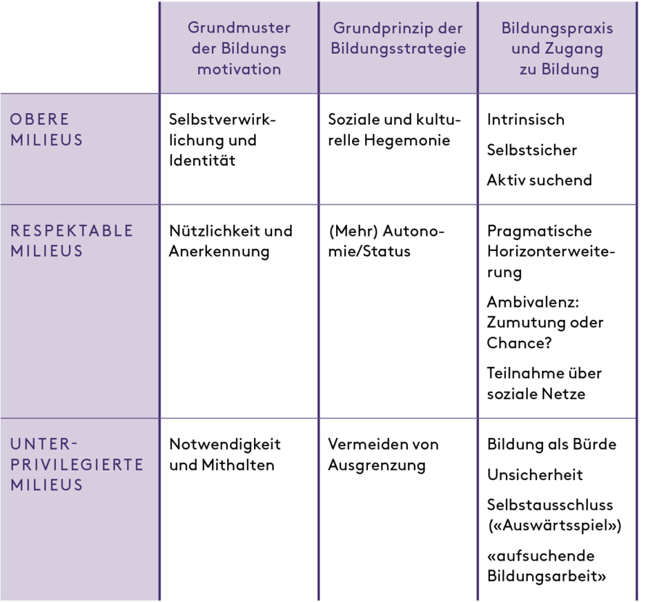 Die Perspektive der sozialen Milieus kann verbunden werden mit dem von Pierre Bourdieu für das Verstehen des Bildungsgeschehens entwickelten Paradigma der «kulturellen Passung» (Kramer/Helsper 2010). Vereinfacht gesagt ist demnach das institutionelle Bildungssetting nicht einfach auf die Vermittlung von Lerngegenständen zu reduzieren, sondern es ist zugleich ein Ort, an dem eine bestimmte «pädagogische Kultur» herrscht. Diese schliesst ganz unterschiedlich an die Alltagspraxis sozialer Milieus an, denn dem Einmünden in institutionalisierte Bildung gehen unterschiedliche Erfahrungen voraus. Indem dort das Beherrschen einer bestimmten Kultur bzw. eine Affinität dazu implizit erwartet wird, nötigt sie die Lernenden zu «Akkulturation». Anders gesagt: Die Diskrepanz zwischen Alltagskultur und institutioneller Kultur verlangt eine Art Überbrückungsarbeit, die die Lernenden erbringen müssen – und die umgekehrt die Weiterbildungseinrichtungen unterschiedlich herausfordert und zur Entwicklung von «Milieusensibilität» auffordert.