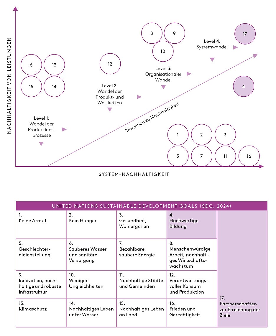 Folgt man dem CapSEM1-Modell (Fet et al., 2023; Fet und Knudson, 2021), so ist eine systemumfassende Partnerschaft von Institutionen für die Erreichung von Nachhaltigkeitszielen unerlässlich. Die Bedarfe verschiedenster Stakeholder sollen ebenso ganzheitlich berücksichtigt werden wie auch deren Wirksamkeit auf nachhaltige Prozesse, Produkte und Dienstleistungen. Weiterbildungsinstitutionen sind dabei nicht nur ein beliebiger Teil dieses Systems. Zum einen wird mit dem SDG 4 eine klare Forderung an Bildungsinstitutionen gerichtet, zu denen auch die Weiterbildung zählt. Diese bezieht sich auf die Gewährleistung einer inklusiven und gleichberechtigten Bildung und die Bereitstellung von Gelegenheiten für lebenslanges Lernen (SDG, 2024). Zum anderen generiert der Anspruch an Nachhaltigkeit veränderte Kompetenzerwartungen an die vielzähligen Akteure und Akteurinnen aus Gesellschaft und Ökonomie. Hier fungieren Weiterbildungsinstitutionen als wichtiger Partner im Sinne der Befähigung zu nachhaltigem Handeln auf Individual- und auf Systemebene.