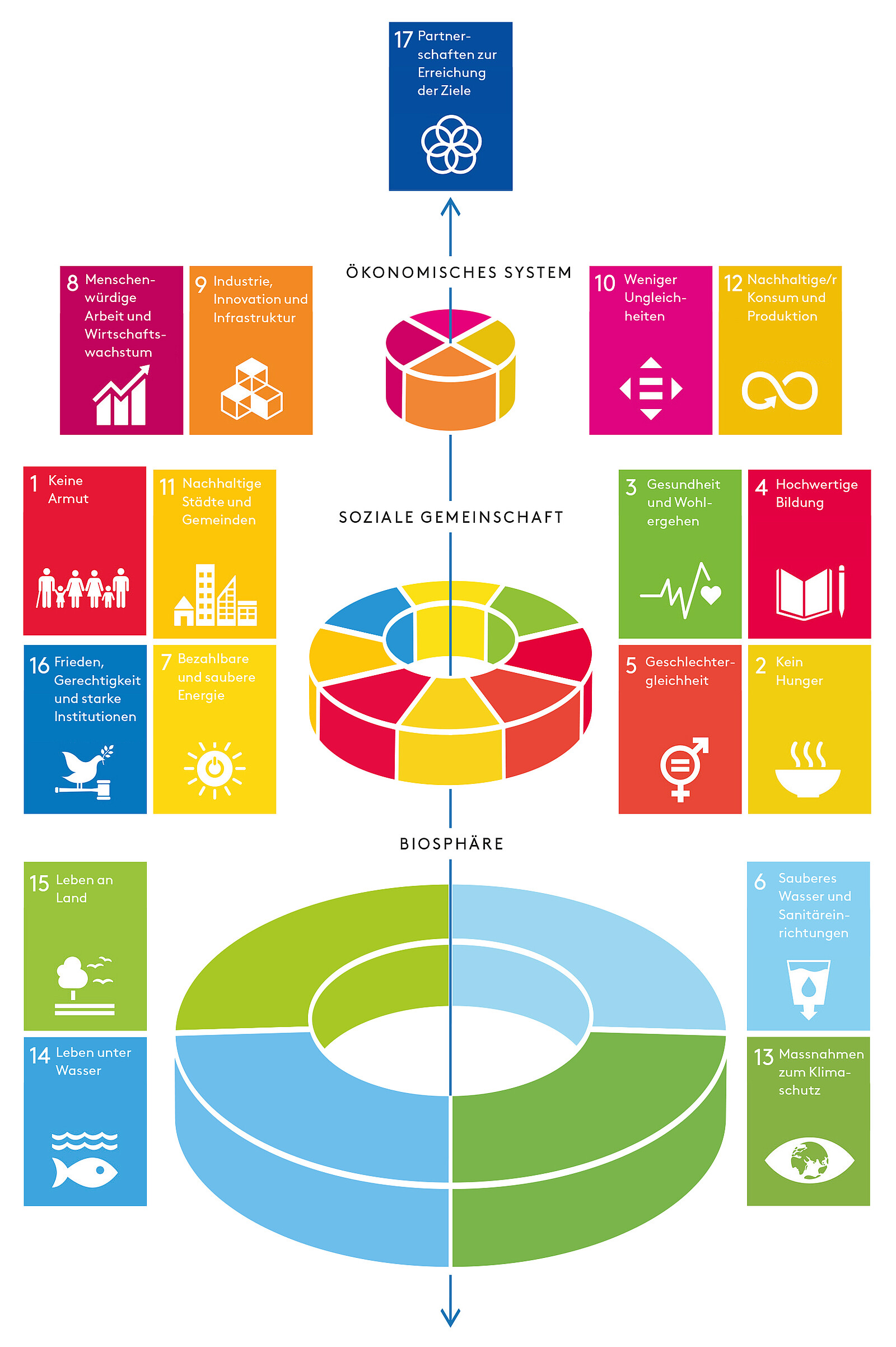 Auch Nachhaltige Entwicklung ist ein traditionsreiches Konzept (World Commission 1987), das ursprünglich oft durch das Zusammenspiel der drei «Säulen» Ökonomie, Ökologie und Soziales bestimmt wurde. Diese Sichtweise ist zwischenzeitlich vielfach kritisiert worden, weil sie den sachlich unzutreffenden Eindruck vermitteln kann, ein Mangel an ökologischer Nachhaltigkeit könnte etwa durch ein besonders hohes Mass an ökonomischer Nachhaltigkeit ausgeglichen werden. Inzwischen haben sich gegenüber dem Drei-Säulen-Modell an vielen Stellen Vorrangmodelle durchgesetzt. Unabhängig von der genauen inhaltlichen Ausgestaltung gehen diese – im Einklang mit dem Drei-Säulen-Modell – davon aus, dass Nachhaltigkeit verschiedene Dimensionen adressieren muss (und soziale und wirtschaftliche Aspekte gehören hier auch immer dazu). Im Unterschied zu jenem stellen sie diese allerdings in einen hierarchischen Zusammenhang. So sortiert das «Wedding Cake»-Modell die Sustainable Development Goals (SDG) in drei Ebenen (vgl. Abb. 1). Die Darstellung macht deutlich, dass etwa der Erhalt der Biosphäre eine materielle Voraussetzung dafür ist, dass Werte einer nachhaltigen sozialen Gemeinschaft (und dann auch einer nachhaltigen Wirtschaft) überhaupt angestrebt werden können.