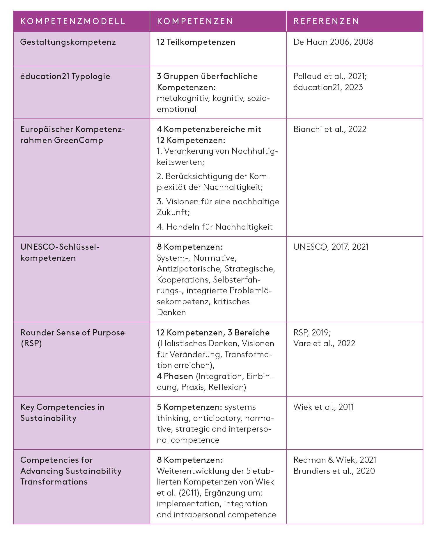 Im deutschsprachigen Raum prägte lange Zeit das Modell der «Gestaltungskompetenz» von de Haan (2008) die Diskussion, welches darauf abzielt, eigenverantwortliches Handeln und Mitgestalten im Sinne einer nachhaltigen Entwicklung zu fördern. Pellaud und Kolleg*innen entwickelten darauf aufbauend jüngst eine Typologie, die von éducation21 aufgenommen wurde und besonders auf die schulische Bildung (Sek. I und II) in den verschiedenen Sprachregionen der Schweiz ausgerichtet ist (éducation21, 2023; Pellaud et al., 2021). Auf europäischer Ebene stellt der Kompetenzrahmen GreenComp der EU einen strategischen Ansatz dar, der BNE im Sinne ökologischer Nachhaltigkeit unterstützen und eine breite Zielgruppe in allen Bildungsbereichen ansprechen soll (Bianchi et al., 2022). Auf globaler Ebene wiederum brachte die UNESCO ein Kompetenzmodell heraus, das an den globalen Zielen der nachhaltigen Entwicklung ausgerichtet ist und neben allen Bildungsstufen auch die Öffentlichkeit adressiert (UNESCO, 2021).
