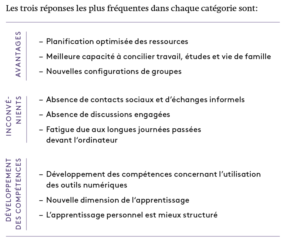 Parmi les avantages, les étudiants ont cité le gain de temps lié à la suppression des temps de trajet et les économies en termes de frais de déplacement. La possibilité de mieux concilier le travail, la vie de famille et les loisirs a été citée comme un avantage notable par tous les groupes d’étudiants. La capacité d’assumer ses obligations familiales et la possibilité de mieux concilier l’enseignement avec un travail par équipes sont également des avantages qui ressortent de cette enquête. Un autre point intéressant soulevé par les personnes sondées est la création de nouvelles configurations du fait de la répartition aléatoire des travaux en groupe dans les espaces virtuels. Cela a permis un «brassage» des échanges. Enfin, grâce à l’emploi de casques pendant les cours en ligne, les étudiants ont précisé qu’ils ont pu pratiquer une activité physique plus soutenue que lors des cours en présentiel.