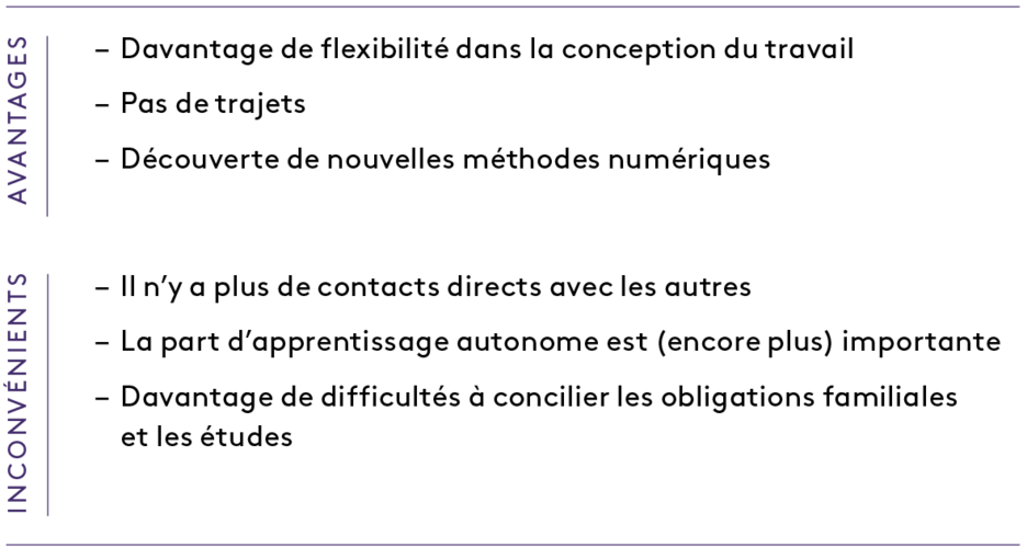 Les enquêtes et la bibliographie font ressortir différents avantages et inconvénients liés à l’enseignement en ligne. Ils varient en fonction de la situation de vie et du type d’études. Dans l’enquête allemande menée auprès d’étudiants à temps complet, les études au format numérique sont perçues comme étant plus pénibles. En effet, les étudiants revenus au domicile parental sont plus fortement intégrés dans les structures familiales que les étudiants qui ne vivent plus chez leurs parents. Les étudiants à temps partiel de Careum Haute école de santé déclarent quant à eux mieux concilier le travail, la vie de famille et les études (en ligne).