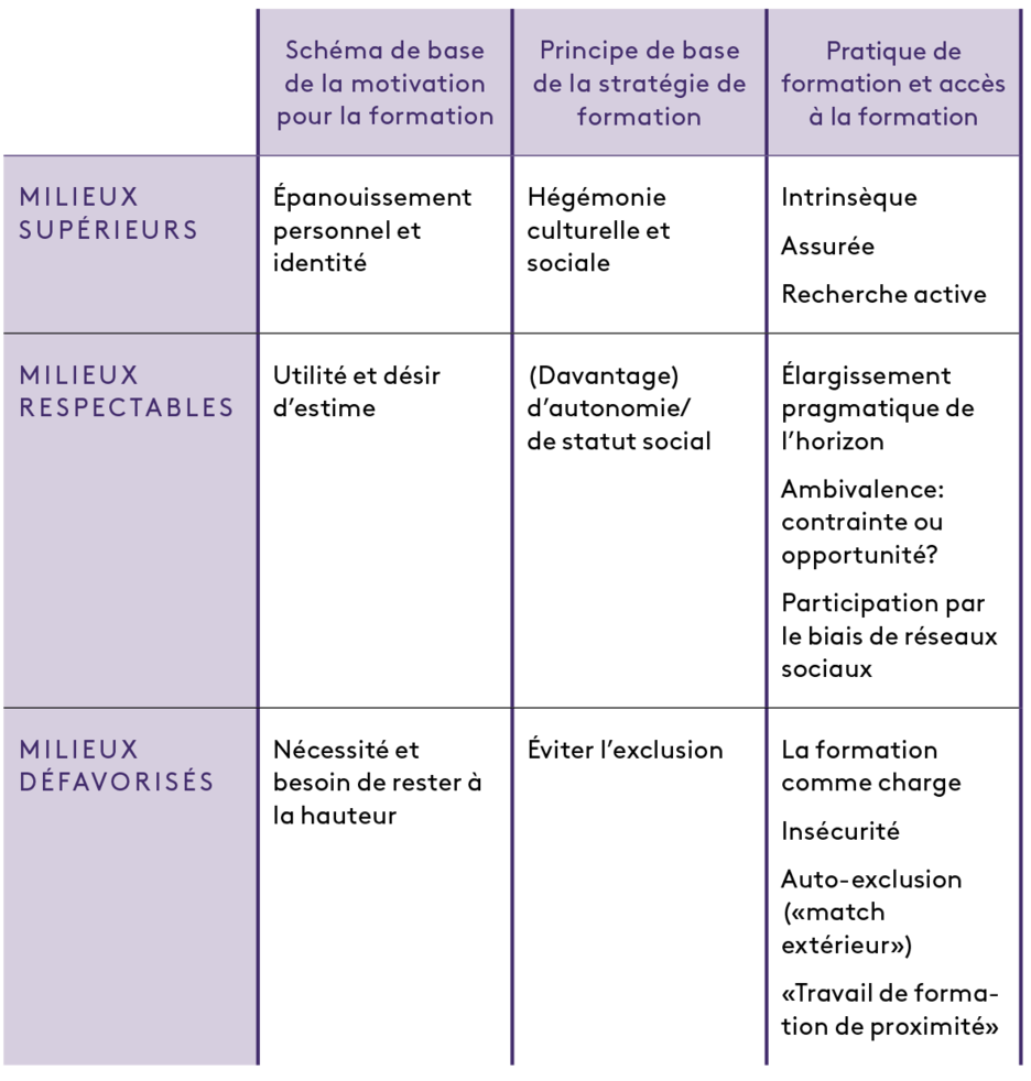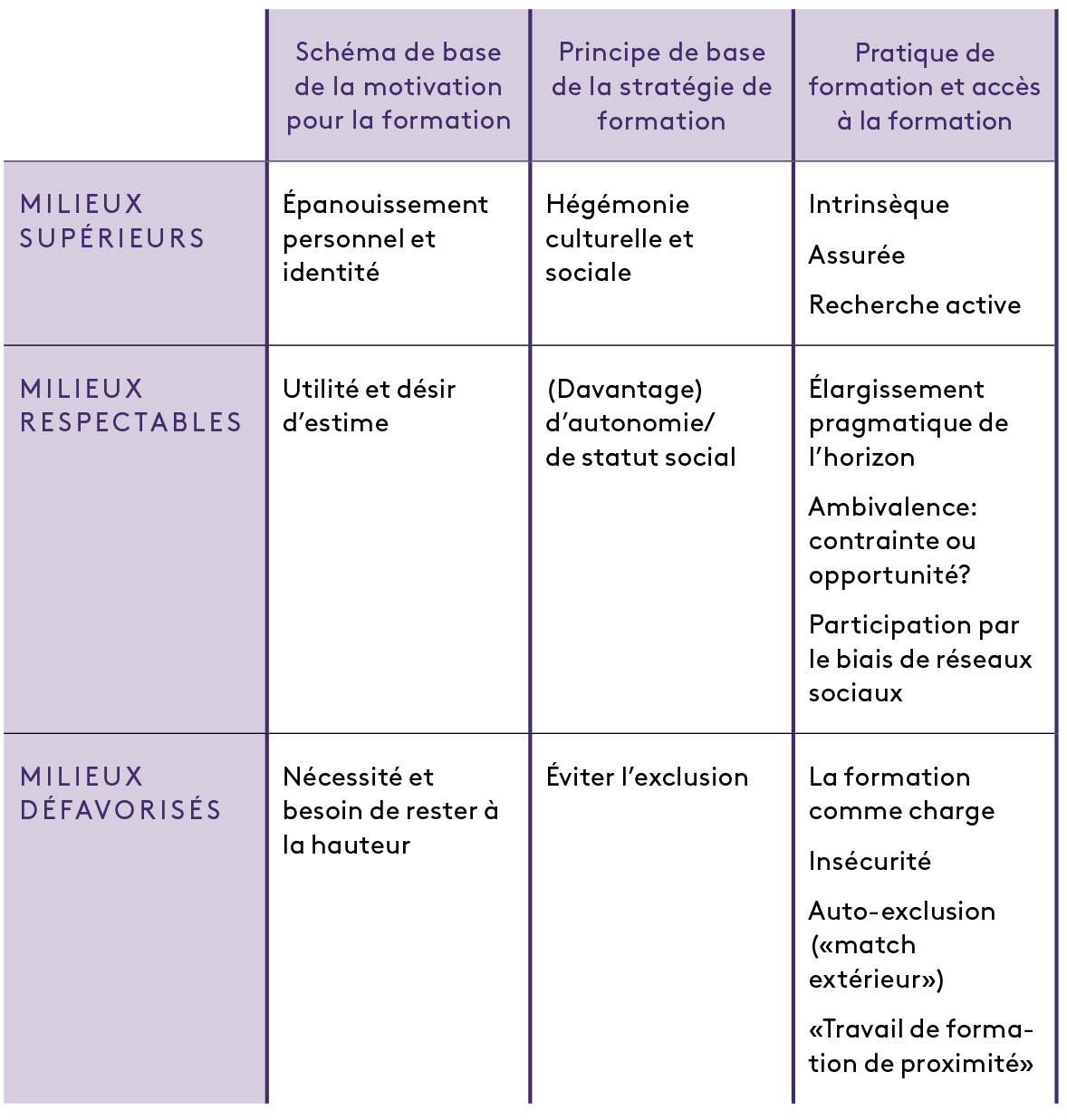 Si l’on veut développer des «contre-stratégies», cela exige tout d’abord une compréhension approfondie de ces rapports. La notion de «milieu social» peut y contribuer. On peut entendre les milieux sociaux comme des groupes d’individus ayant un mode de vie similaire (cf. Vester et al. 2001). Les personnes d’un même milieu se ressemblent quant à leurs préférences et attitudes par rapport au travail et à la formation, à la famille et aux amis, aux loisirs ainsi qu’à la participation sociale. Le regard sur les milieux sociaux met ainsi en lumière comment les intérêts, motifs et obstacles relatifs à la formation sont ancrés dans les contextes de vie, et comment la formation continue est vue subjectivement.