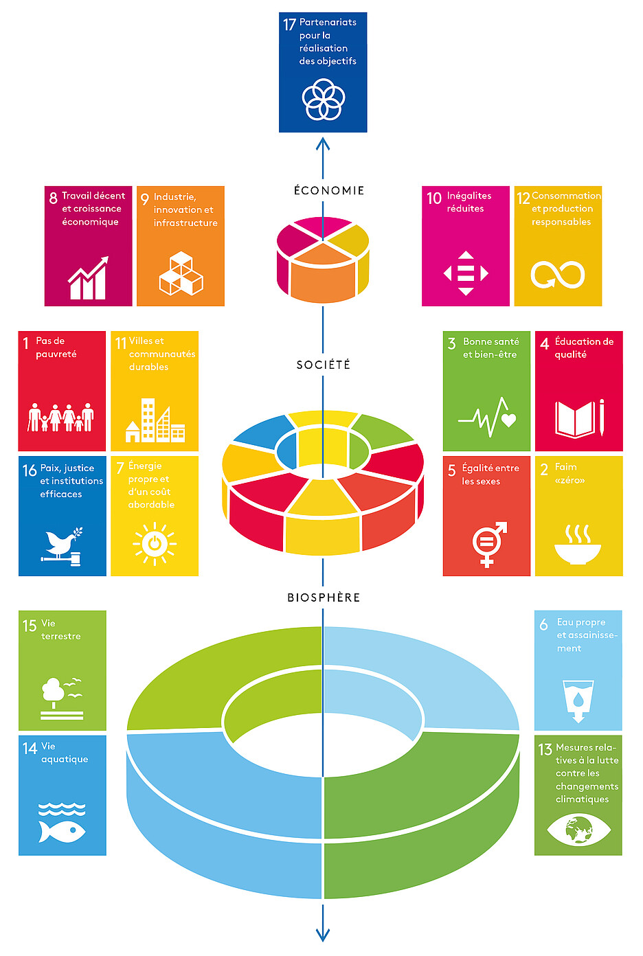 Le développement durable est lui aussi un concept qui a une longue histoire (Commission mondiale 1987). À l’origine, on le définissait souvent par l’interaction entre les trois «piliers» que sont l’économie, l’écologie et la société. Cette perspective a toutefois été abondamment critiquée depuis, car elle peut donner l’impression, contredite par les faits, qu’un manque de durabilité écologique pourrait par exemple être compensé par un niveau particulièrement élevé de durabilité économique. Des modèles établissant différentes priorités se sont entre-temps imposés dans de nombreux endroits en lieu et place du modèle des trois piliers. Quel que soit le contenu exact de ces modèles, ceux-ci partent du principe, conformément au modèle des trois piliers, que la durabilité doit prendre en compte différentes dimensions (dont font toujours partie les questions économiques et sociales). Contrairement au modèle initial, ces nouveaux modèles placent toutefois ces dimensions dans un rapport hiérarchique. Le modèle du «Wedding Cake» répartit ainsi les objectifs de développement durable (ODD) sur trois niveaux (cf. figure 1). Le schéma montre bien que la préservation de la biosphère, par exemple, constitue une condition matérielle préalable pour pouvoir aspirer aux valeurs d’une société durable (et par suite d’une économie durable).