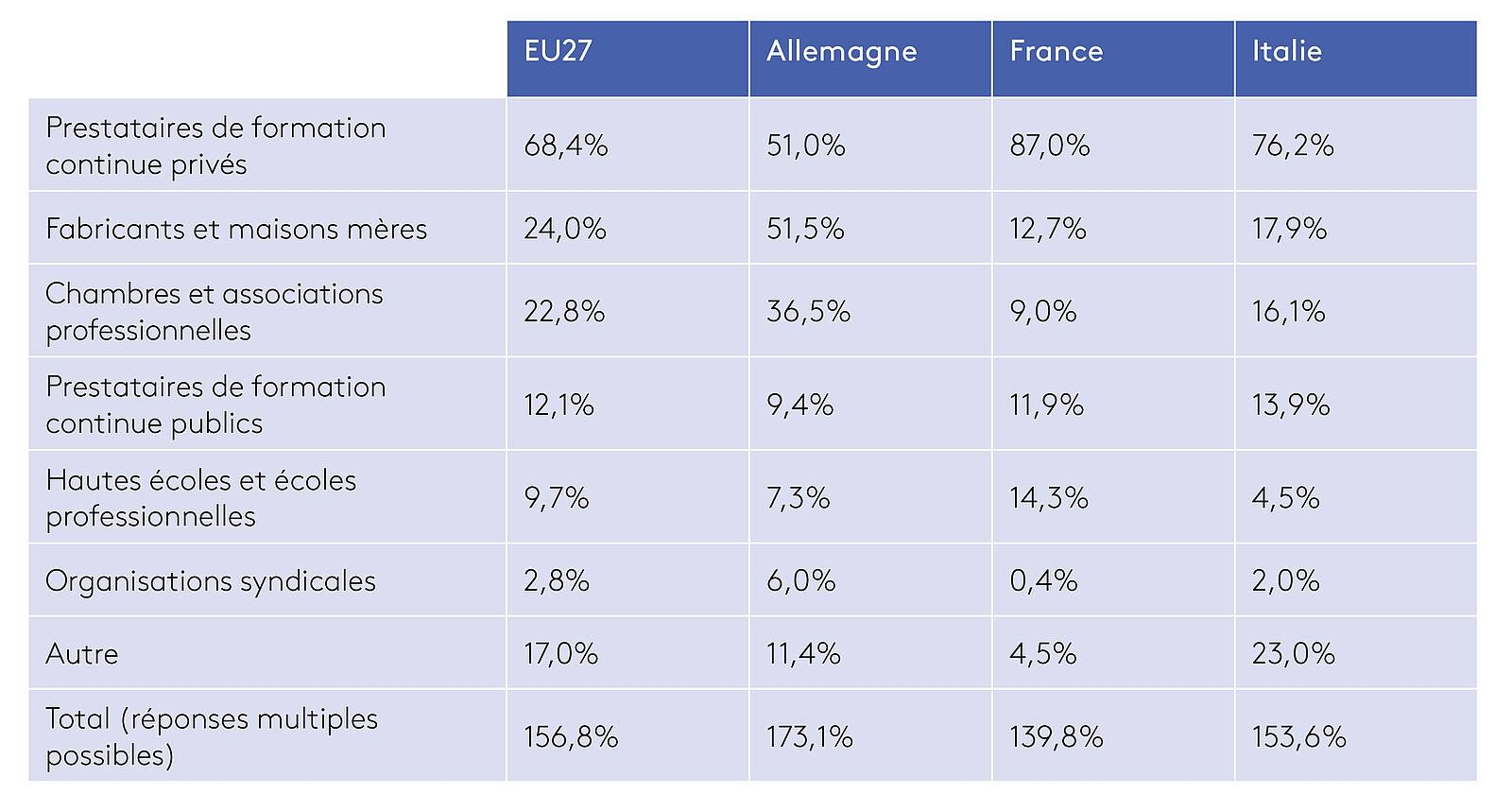 En Italie, où les entreprises proposent dans l’ensemble une offre de formation continue inférieure à la moyenne, les entreprises recourent principalement à des prestataires privés, quoique les prestataires publics jouent également un certain rôle. Avec 23%, la catégorie «Autre» a obtenu un score très élevé. Il peut s’agir là d’autres partenaires qui n’ont pas été couverts par les différentes options de l’enquête, comme des associations spécialisées proposant des formations continues, des agences pour l’emploi, des formatrices et formateurs à leur compte, des groupes professionnels ou encore des plateformes numériques. En Suisse, l’École-club Migros est un bon exemple de structure qui ne peut pas être considérée comme un prestataire privé commercial au sens classique, puisqu’elle puise ses origines dans les coopératives.
