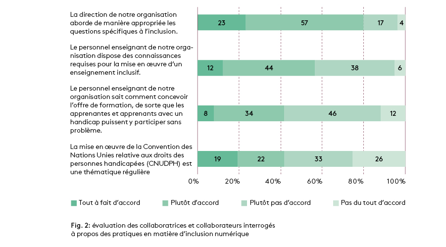 Dans le cadre de l’aspect «cultures», nous avons d’abord recueilli les évaluations sur l’attitude générale des collaboratrices et collaborateurs vis-à-vis de l’inclusion des personnes handicapées (cf. fig. 3). Nous souhaitions connaître l’importance accordée à l’inclusion des personnes handicapées dans les établissements des personnes interrogées. Une grande majorité estime que ce thème revêt une importance majeure dans leur établissement. Les collaboratrices et collaborateurs avec ou sans fonction de direction sont, dans une large mesure, d’accord sur ce point. Par contre, ces personnes sont beaucoup moins nombreuses à être d’avis que le thème de l’accessibilité numérique occupe une place importante dans leur établissement: un peu plus de la moitié des établissements réfute cette affirmation. Dans quelques établissements seulement, les personnes interrogées jugent que les collaboratrices et collaborateurs se montrent critiques vis-à-vis du thème de l’inclusion des apprenantes et apprenants avec un handicap. Ces résultats montrent que, de manière générale, les organisations ont une attitude ouverte vis-à-vis de l’inclusion des apprenantes et apprenants avec un handicap, mais qu’elles sont beaucoup moins nombreuses à prioriser des thèmes comme l’accessibilité numérique ou l’accessibilité de manière générale.