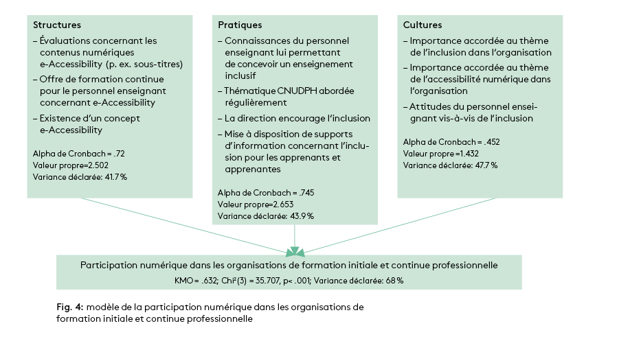 La figure 4 montre la méthode et les valeurs caractéristiques statistiques utilisées pour l’ACPNL appliquée aux aspects de l’indice d’inclusion dans la mise en œuvre de la participation numérique au sein des établissements de la formation initiale et continue professionnelle. Presque tous les éléments pris en compte sont contenus dans les réponses de seulement une partie des personnes interrogées (qui disposent des connaissances à ce sujet dans leur organisation). Par conséquent, l’échantillon utilisé pour les étapes d’analyse suivantes se limite à n = 45. Cela restreint les possibilités de désagrégation supplémentaire de l’échantillon. L’analyse a permis d’obtenir des résultats d’une qualité moyenne à bonne. Cela signifie que les évaluations recueillies sur les aspects «structures», «pratiques» et «cultures» de la participation numérique reflètent de manière satisfaisante le degré de mise en œuvre de cette thématique dans les organisations.