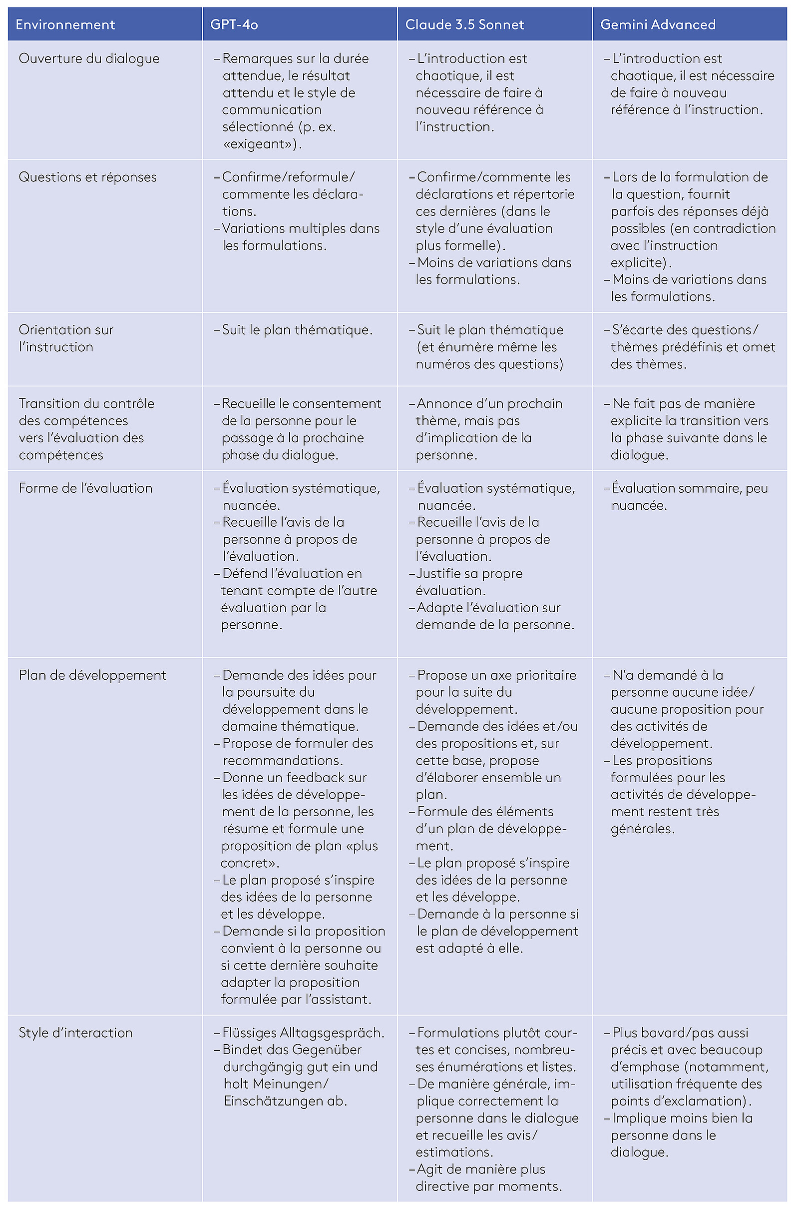 Le fait que Claude 3.5 Sonnet rectifie aussi rapidement sa propre évaluation et l’harmonise avec l’auto-évaluation de l’utilisatrice ou de l’utilisateur coïncide avec l’image répandue que l’on se fait des agents conversationnels («chatbots»), qui ont tendance à être trop coopératifs et à aller excessivement dans le sens de l’utilisatrice ou de l’utilisateur. Cela peut convenir à certains contextes d’interaction. En revanche, lorsque les chatbots doivent être pris au sérieux en tant que tuteur ou partenaire pour des bilans de compétences dans le contexte de la formation et du développement, ils doivent faire preuve d’une plus grande fermeté.
