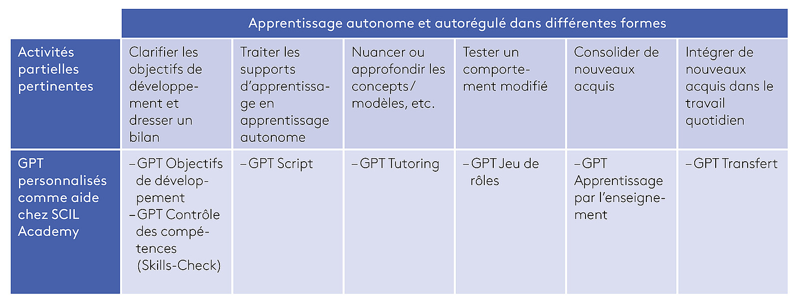 Cet article montre que les activités d’apprentissage autonomes et auto-organisées peuvent être développées par des assistants numériques spécialement configurés. Ces derniers peuvent apporter un soutien dans différentes tâches en lien avec la gestion et la réalisation de l’apprentissage auto-organisé: état des lieux, clarification des objectifs, planification de la méthode, élaboration de thèmes et de contenus, préparation à la mise en œuvre dans le contexte professionnel. Afin de garantir la mise en œuvre réussie d’une telle approche, plusieurs conditions doivent être remplies: mettre à disposition des bibliothèques de GPT personnalisés, habiliter les utilisatrices et utilisateurs, développer le rôle des responsables de formation vers l’accompagnement de l’apprentissage et organiser/coordonner les environnements d’apprentissage.
