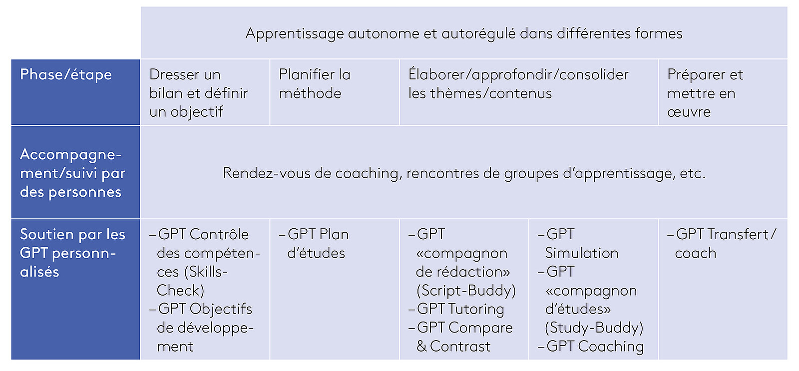 Cependant, cette aide technique n’est pas toujours suffisante pour garantir la mise en œuvre réussie de l’apprentissage autonome et auto-organisé. Le soutien à l’apprentissage autorégulé doit être abordé avec une approche plus large. En fonction de la situation, des personnes accompagnant l’apprentissage, des animatrices et animateurs, ou des coachs sont nécessaires (p. ex. eLearning Journal, 2024). Les GPT personnalisés peuvent accessoirement apporter un soutien supplémentaire et alléger la charge de travail des personnes accompagnant l’apprentissage, animatrices et animateurs, ou coachs. Le tableau 3 explique cette conception de base.