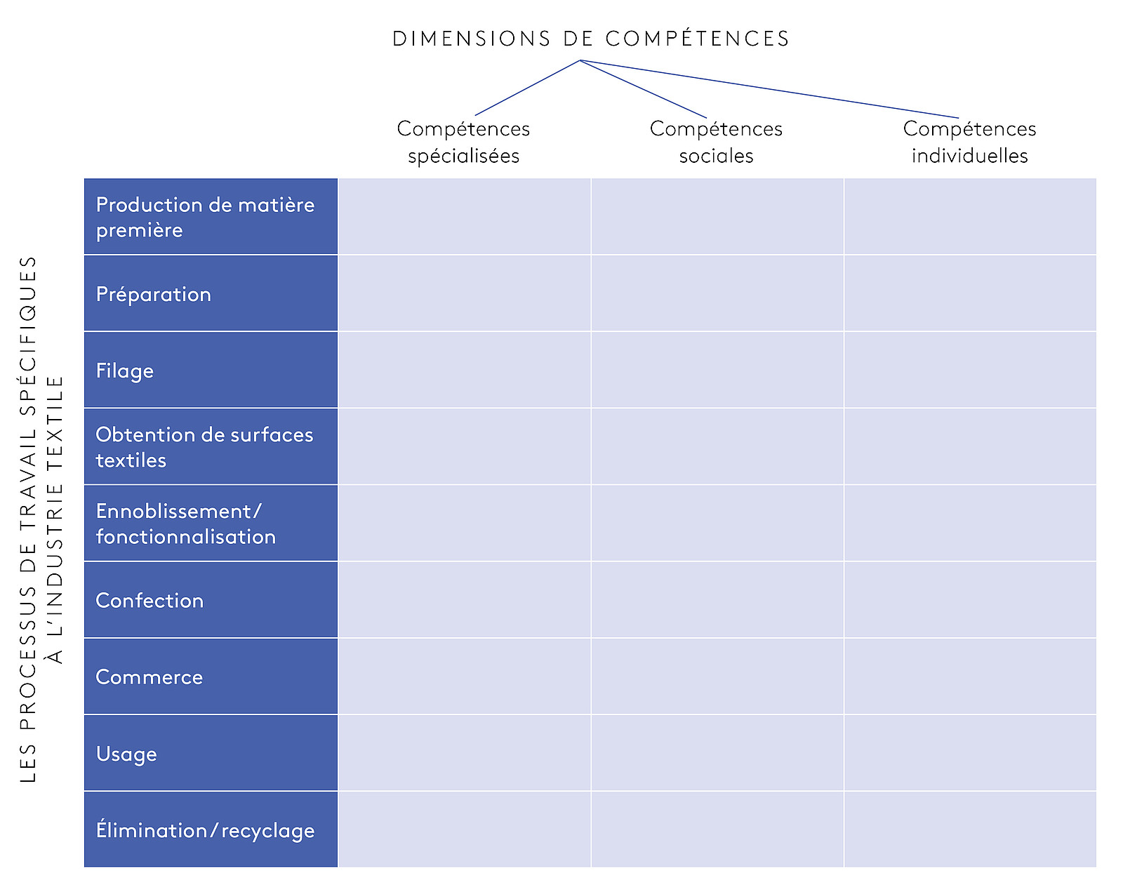 La représentation sous forme de grille a été choisie afin de pouvoir visualiser l’intention d’une approche structurée pour le procédé participatif d’identification des besoins. L’axe vertical de la grille de compétences (cf. graphique no 1) se distingue par sa focalisation sur les processus de travail typiques pour ce secteur. Cela correspond au plan hiérarchique de l’action professionnelle, où les prestations de travail directes occupent la place centrale et sur lequel les membres du personnel peuvent influer (Kastrup et al., 2021, p. 24). Cette étape de concrétisation des différents champs d’action professionnels est nécessaire, puisque le secteur concerné se distingue par l’énorme diversité de ses champs d’application et de ses métiers. La distinction des processus de travail spécifiques servira ensuite de base pour identifier les aspects concrets de ces processus ayant un lien avec le développement durable (ou avec une autre thématique pertinente). Par cette méthode, on aspire à se concentrer sur des processus précis et à y réfléchir en vue de déterminer leur pertinence pour l’objectif supérieur; on minimise ainsi le risque de se perdre dans des banalités au cours d’un tel processus d’identification des besoins. La distinction des processus de travail typiques peut se faire à l’échelle du secteur, de la profession ou de l’entreprise. Dans notre projet, nous avons suivi une approche spécifique au secteur afin que la grille de compétences puisse être adaptée autant pour des prestataires de formation continue spécialisés dans cette branche que pour diverses entreprises. Pour identifier les processus de travail typiques au secteur du textile, nous avons eu recours à des entretiens avec des partenaires issus de la pratique dans l’industrie textile, à une enquête par questionnaire ainsi qu’à la recherche scientifique. Les résultats obtenus nous ont permis de définir la production de matière première, la préparation, le filage, l’obtention de surfaces textiles, l’ennoblissement et la fonctionnalisation, la confection, le commerce, l’usage et l’élimination/le recyclage comme processus de travail spécifiques au secteur du textile, tout au long de sa chaîne de valeur4.