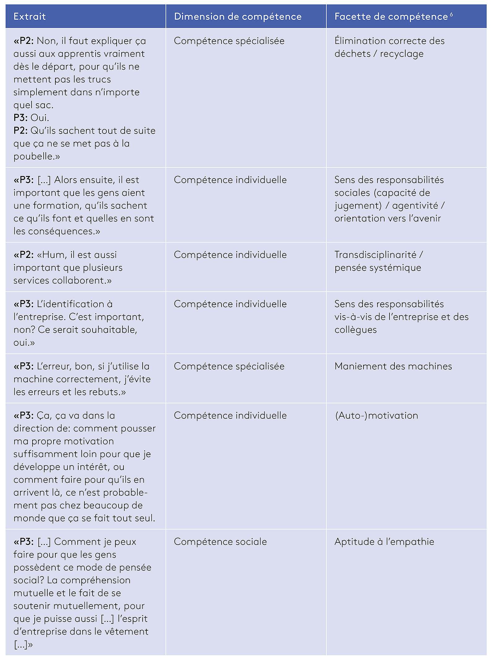 La dernière étape a consisté à remplir les cases du modèle laissées vides jusqu’alors: les compétences requises ont été insérées en se basant sur les contenus pertinents (concernant, ici, le développement durable) identifiés pour les processus de travail précédemment définis. Dans notre projet, nous nous sommes appuyés pour cela sur les panneaux réalisés par chaque groupe. Ensuite, les transcriptions des interactions au sein des différents petits groupes ont été analysées pour en déduire des compétences requises chez le personnel, et surtout chez les personnes en apprentissage dans le secteur du textile (cf. tableau no 1).