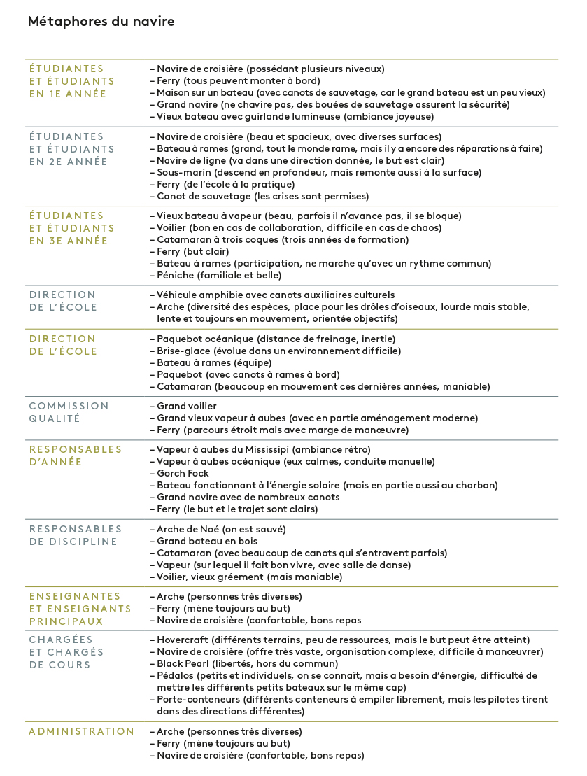 Dans le cadre d’un projet d’accompagnement «nouvelle structure de direction» au sein d’une haute école, on a demandé – il y a quelques années, à l’ensemble du personnel et avant le début du projet – dans un sondage anonyme en ligne, d’indiquer une métaphore leur paraissant appropriée pour leur haute école. Sans aucune intervention guidant les réponses, près de la moitié des descriptions métaphoriques ainsi obtenues se situaient dans le domaine de la navigation.